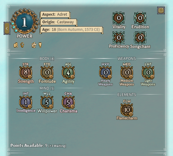 - 10 from attunement (Attunement-less characters instead spawn in with an extra 10 investment points to distribute freely.)