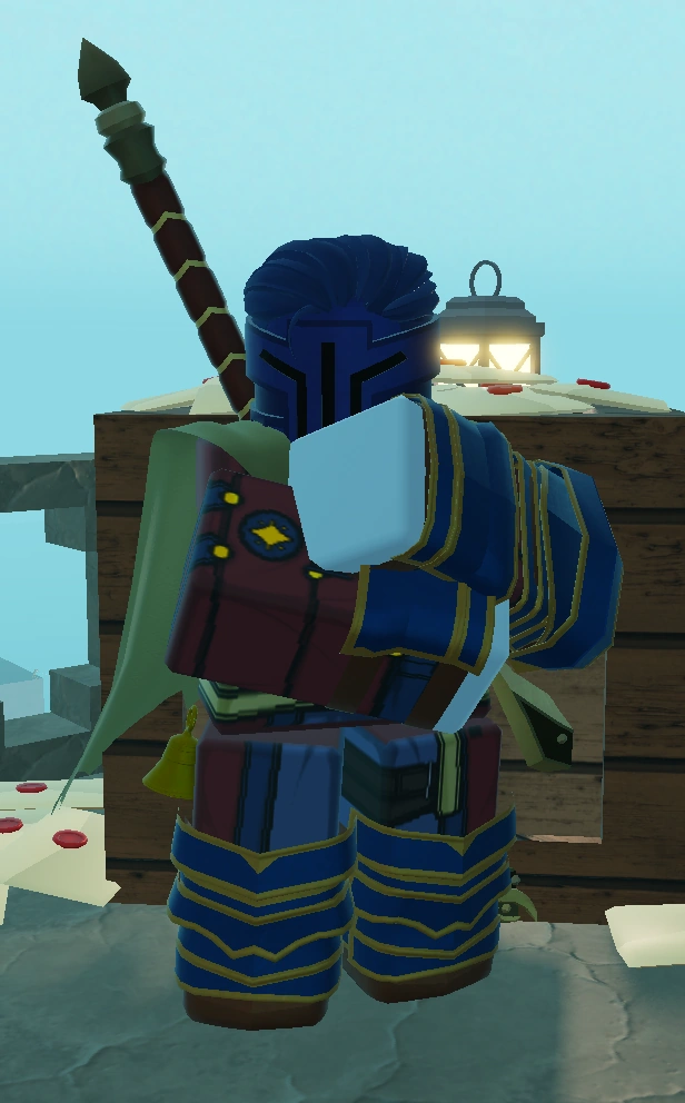 He wears the Authority Captain Uniform Outfit with a blue Authority Helm, Brilliant Cape, and Brilliant Boots, forming quite the garish outfit. Chud Steel holsters a bell at his hip, signifying his strength to obtain a Resonance.