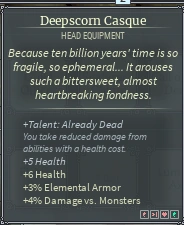Grants the user the "Already Dead" Unique Equipment Talent, which reduces the self damage taken from certain abilities. These include: Static Withdraw's Jumpstart buff, Flame Within's self damage on activation, Symbiotic Sustain's wither, Shadow Travel, Shade Devour, and Rush Hour. Additionally this entirely removes the self damage taken by the Deepspindle running critical.