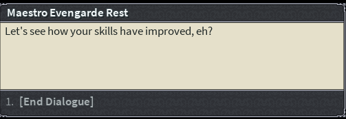 *The Maestro smiles*. Ah, well if it isn't my friend, [First Name]. [Player has obtained a weapon from Evengarde Rest]
