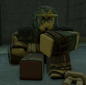 A Khan with great stature, he's around twice the height of the player. He has wrinkles on his face and greyed out dreads, signifying his older age. Titus wields the Worldpiercer Gauntlets and wears the Titus's Raiment with his Titus's Cape. He also carries a bell on his hip, signifying that he is strong enough to have obtained a Resonance.
