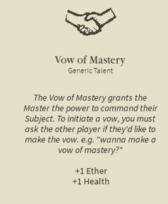 Vow of Mastery is a Talent which allows the user to make other players into subjects and issue commands to those subjects. While any player can be a subject (so long as they don't already have a master), the Talent is required to become a master, and has a requirement of 20 Charisma.